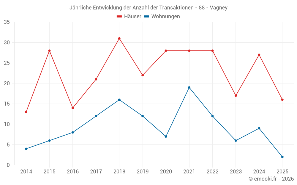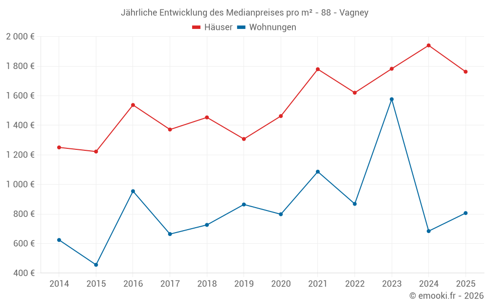Der Durchschnittspreis auf den 27 Hausgeschäften der letzten 12 Monate in der Gemeinde Vagney betrug 1 797 € pro Quadratmeter für einen mittleren Immobilienwert von 163 400 €. Über diesen Zeitraum hinweg lagen 60% der Transaktionen zwischen 1 288 und 2 361 € pro Quadratmeter (vom 2. bis zum 8. Dezil).