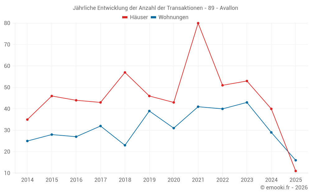 Der Durchschnittspreis auf den 33 Hausgeschäften der letzten 12 Monate in der Gemeinde Avallon betrug 1 364 € pro Quadratmeter für einen mittleren Immobilienwert von 104 000 €. Über diesen Zeitraum hinweg lagen 60% der Transaktionen zwischen 974 und 1 851 € pro Quadratmeter (vom 2. bis zum 8. Dezil).