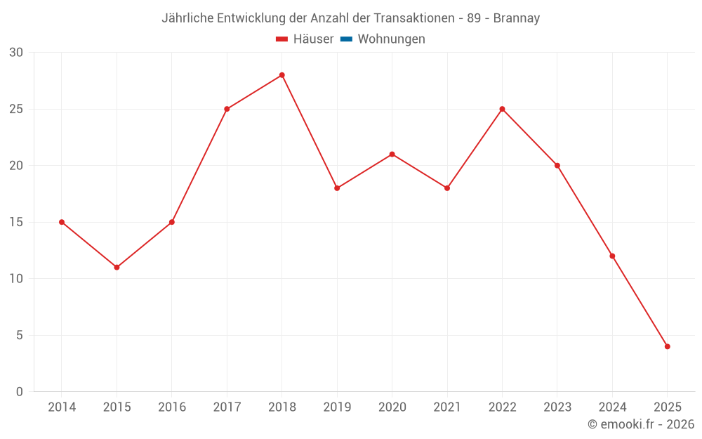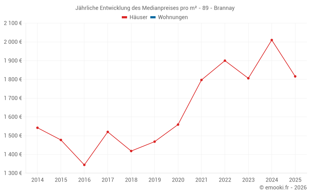 Der Durchschnittspreis auf den 23 Hausgeschäften der letzten 24 Monate in der Gemeinde Brannay betrug 1 826 € pro Quadratmeter für einen mittleren Immobilienwert von 150 000 €. Über diesen Zeitraum hinweg lagen 60% der Transaktionen zwischen 1 144 und 2 500 € pro Quadratmeter (vom 2. bis zum 8. Dezil).