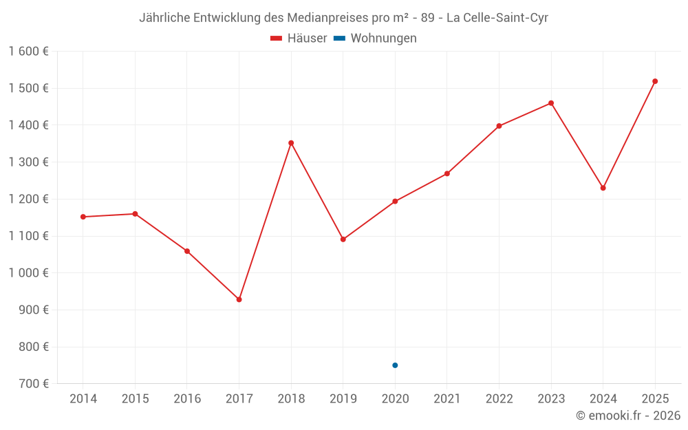 Der Durchschnittspreis auf den 29 Hausgeschäften der letzten 24 Monate in der Gemeinde La Celle-Saint-Cyr betrug 1 403 € pro Quadratmeter für einen mittleren Immobilienwert von 125 000 €. Über diesen Zeitraum hinweg lagen 60% der Transaktionen zwischen 940 und 2 021 € pro Quadratmeter (vom 2. bis zum 8. Dezil).