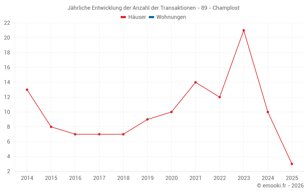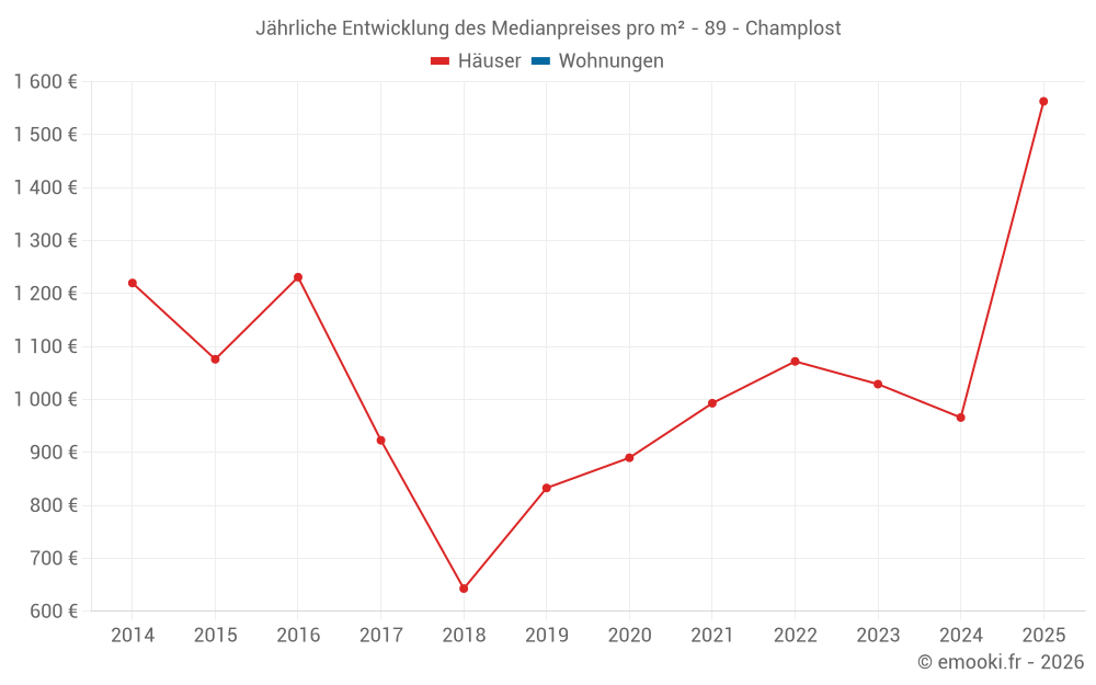 Der Durchschnittspreis auf den 26 Hausgeschäften der letzten 24 Monate in der Gemeinde Champlost betrug 933 € pro Quadratmeter für einen mittleren Immobilienwert von 90 500 €. Über diesen Zeitraum hinweg lagen 60% der Transaktionen zwischen 438 und 1 563 € pro Quadratmeter (vom 2. bis zum 8. Dezil).