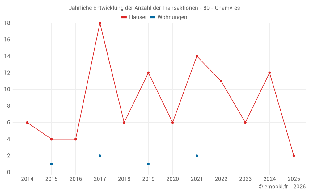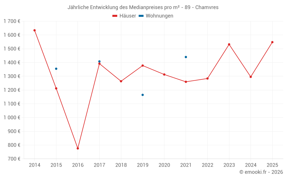 Der Durchschnittspreis auf den 17 Hausgeschäften der letzten 24 Monate in der Gemeinde Chamvres betrug 1 300 € pro Quadratmeter für einen mittleren Immobilienwert von 145 000 €. Über diesen Zeitraum hinweg lagen 60% der Transaktionen zwischen 955 und 2 026 € pro Quadratmeter (vom 2. bis zum 8. Dezil).