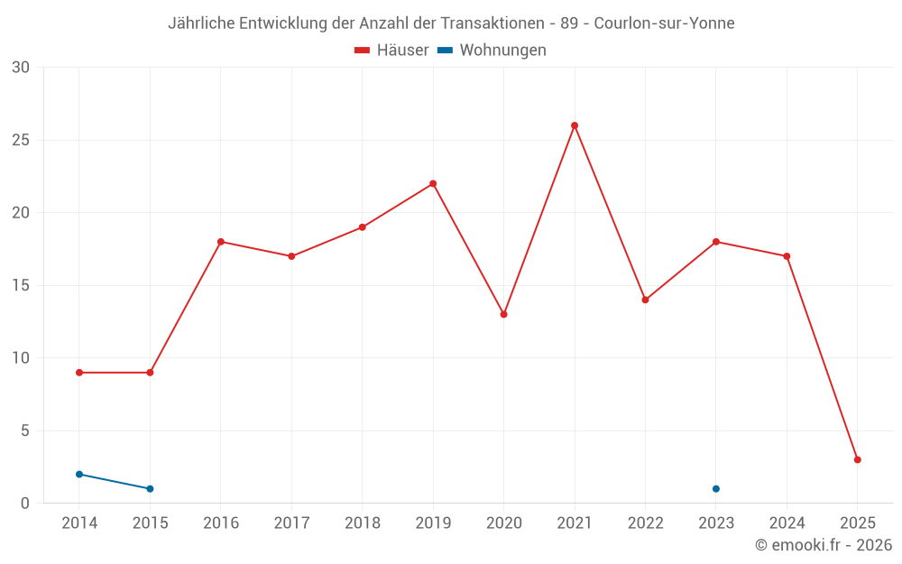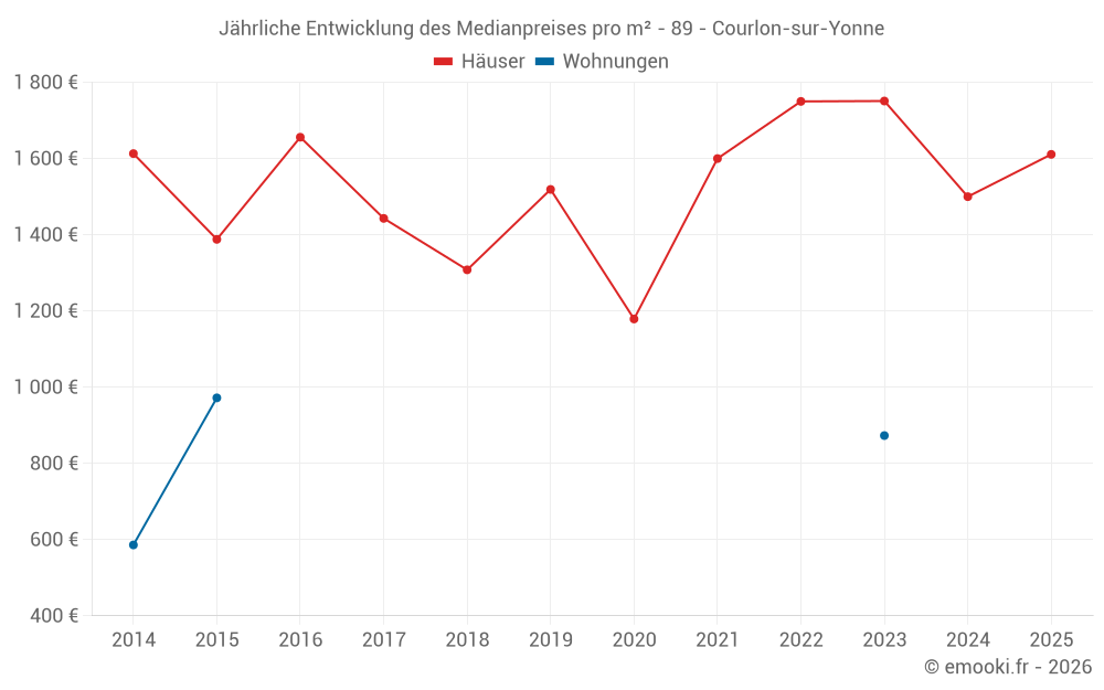 Der Durchschnittspreis auf den 17 Hausgeschäften der letzten 12 Monate in der Gemeinde Courlon-sur-Yonne betrug 1 516 € pro Quadratmeter für einen mittleren Immobilienwert von 150 000 €. Über diesen Zeitraum hinweg lagen 60% der Transaktionen zwischen 988 und 1 773 € pro Quadratmeter (vom 2. bis zum 8. Dezil).