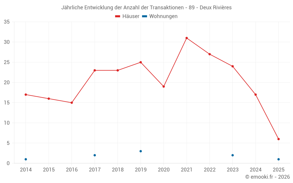 Der Durchschnittspreis auf den 16 Hausgeschäften der letzten 12 Monate in der Gemeinde Deux Rivières betrug 1 122 € pro Quadratmeter für einen mittleren Immobilienwert von 103 870 €. Über diesen Zeitraum hinweg lagen 60% der Transaktionen zwischen 760 und 1 708 € pro Quadratmeter (vom 2. bis zum 8. Dezil).