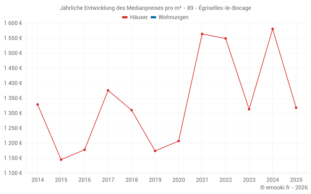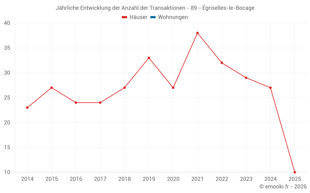 Der Durchschnittspreis auf den 30 Hausgeschäften der letzten 12 Monate in der Gemeinde Égriselles-le-Bocage betrug 1 620 € pro Quadratmeter für einen mittleren Immobilienwert von 106 500 €. Über diesen Zeitraum hinweg lagen 60% der Transaktionen zwischen 1 008 und 1 943 € pro Quadratmeter (vom 2. bis zum 8. Dezil).