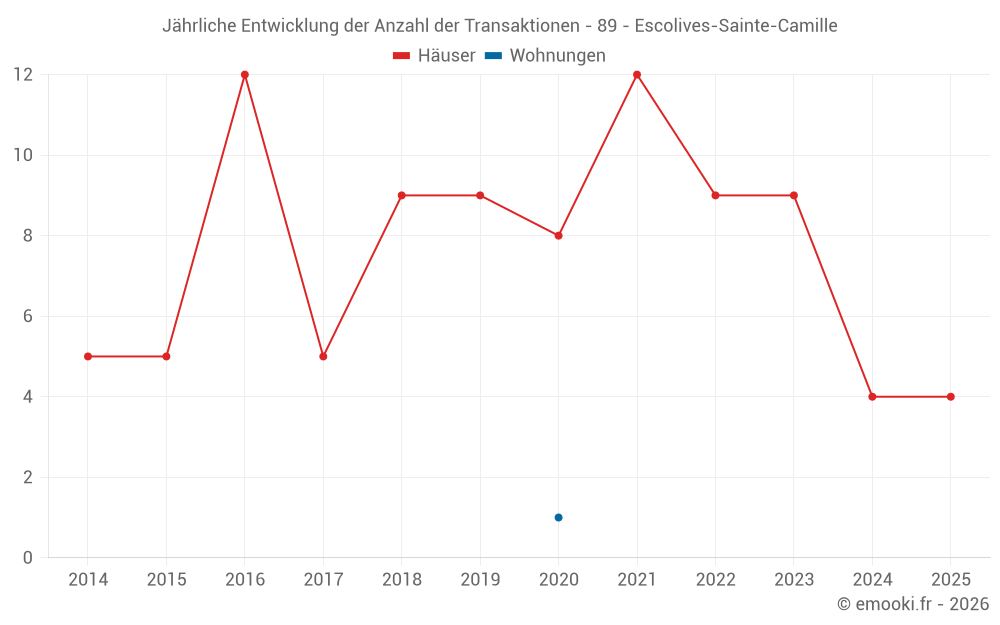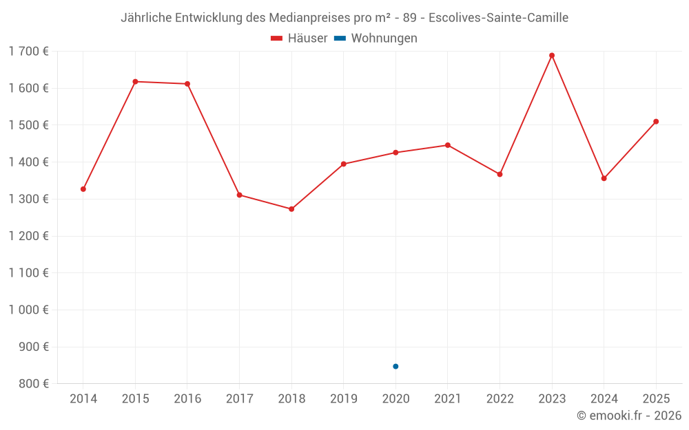 Der Durchschnittspreis auf den 14 Hausgeschäften der letzten 24 Monate in der Gemeinde Escolives-Sainte-Camille betrug 1 609 € pro Quadratmeter für einen mittleren Immobilienwert von 167 000 €. Über diesen Zeitraum hinweg lagen 60% der Transaktionen zwischen 1 006 und 1 934 € pro Quadratmeter (vom 2. bis zum 8. Dezil).