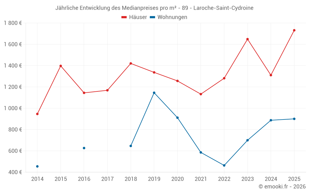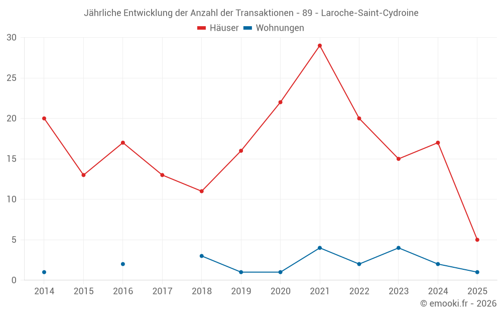 Der Durchschnittspreis auf den 17 Hausgeschäften der letzten 12 Monate in der Gemeinde Laroche-Saint-Cydroine betrug 1 479 € pro Quadratmeter für einen mittleren Immobilienwert von 140 000 €. Über diesen Zeitraum hinweg lagen 60% der Transaktionen zwischen 1 118 und 1 818 € pro Quadratmeter (vom 2. bis zum 8. Dezil).