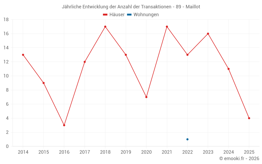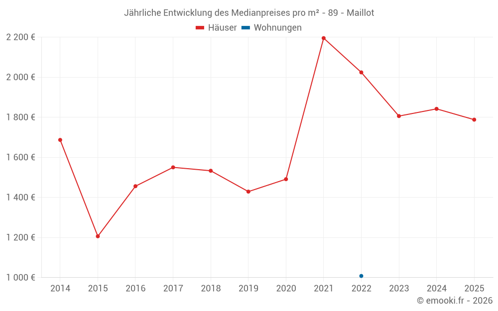 Der Durchschnittspreis auf den 26 Hausgeschäften der letzten 24 Monate in der Gemeinde Maillot betrug 1 837 € pro Quadratmeter für einen mittleren Immobilienwert von 175 000 €. Über diesen Zeitraum hinweg lagen 60% der Transaktionen zwischen 1 429 und 2 279 € pro Quadratmeter (vom 2. bis zum 8. Dezil).