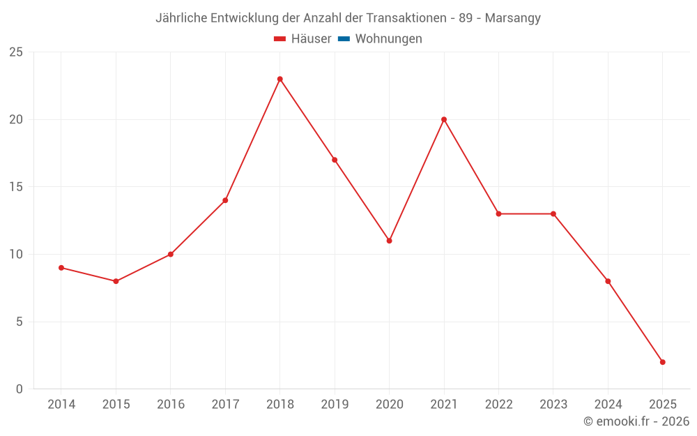 Der Durchschnittspreis auf den 16 Hausgeschäften der letzten 24 Monate in der Gemeinde Marsangy betrug 1 278 € pro Quadratmeter für einen mittleren Immobilienwert von 137 500 €. Über diesen Zeitraum hinweg lagen 60% der Transaktionen zwischen 966 und 1 813 € pro Quadratmeter (vom 2. bis zum 8. Dezil).