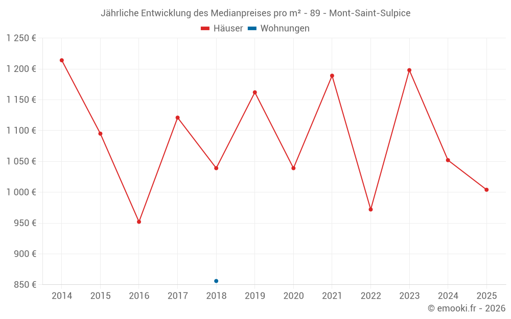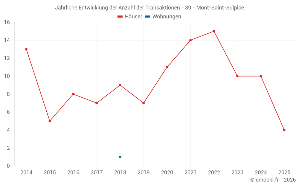 Der Durchschnittspreis auf den 18 Hausgeschäften der letzten 24 Monate in der Gemeinde Mont-Saint-Sulpice betrug 1 126 € pro Quadratmeter für einen mittleren Immobilienwert von 129 500 €. Über diesen Zeitraum hinweg lagen 60% der Transaktionen zwischen 744 und 1 443 € pro Quadratmeter (vom 2. bis zum 8. Dezil).