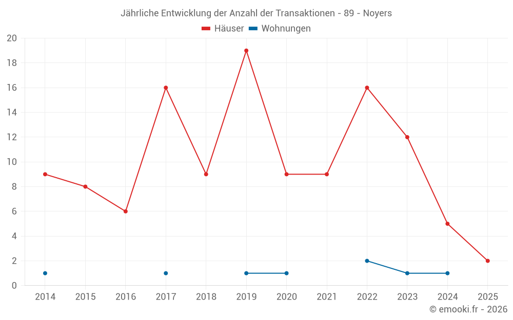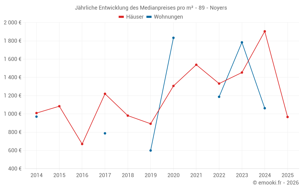 Der Durchschnittspreis auf den 15 Hausgeschäften der letzten 24 Monate in der Gemeinde Noyers betrug 1 516 € pro Quadratmeter für einen mittleren Immobilienwert von 139 000 €. Über diesen Zeitraum hinweg lagen 60% der Transaktionen zwischen 1 269 und 2 132 € pro Quadratmeter (vom 2. bis zum 8. Dezil).