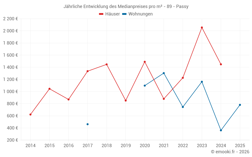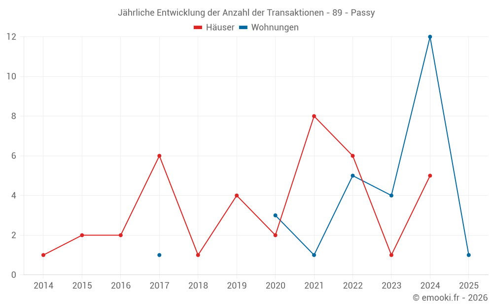 Der Durchschnittspreis auf den 15 Wohnungstransaktionen der letzten 24 Monate in der Gemeinde Passy betrug 365 € pro Quadratmeter für einen mittleren Immobilienwert von 43 670 €. Über diesen Zeitraum hinweg lagen 60% der Transaktionen zwischen 329 und 643 € pro Quadratmeter (vom 2. bis zum 8. Dezil).