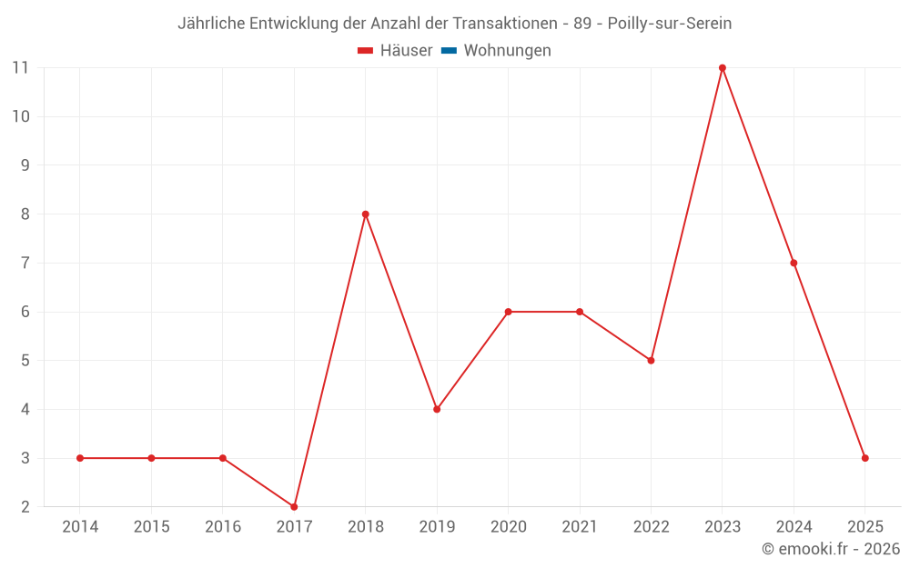 Der Durchschnittspreis auf den 14 Hausgeschäften der letzten 24 Monate in der Gemeinde Poilly-sur-Serein betrug 804 € pro Quadratmeter für einen mittleren Immobilienwert von 42 500 €. Über diesen Zeitraum hinweg lagen 60% der Transaktionen zwischen 340 und 994 € pro Quadratmeter (vom 2. bis zum 8. Dezil).