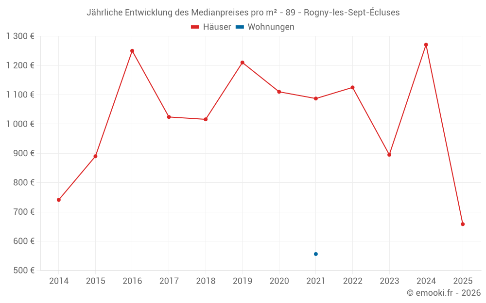 Der Durchschnittspreis auf den 30 Hausgeschäften der letzten 24 Monate in der Gemeinde Rogny-les-Sept-Écluses betrug 1 232 € pro Quadratmeter für einen mittleren Immobilienwert von 84 000 €. Über diesen Zeitraum hinweg lagen 60% der Transaktionen zwischen 678 und 1 619 € pro Quadratmeter (vom 2. bis zum 8. Dezil).