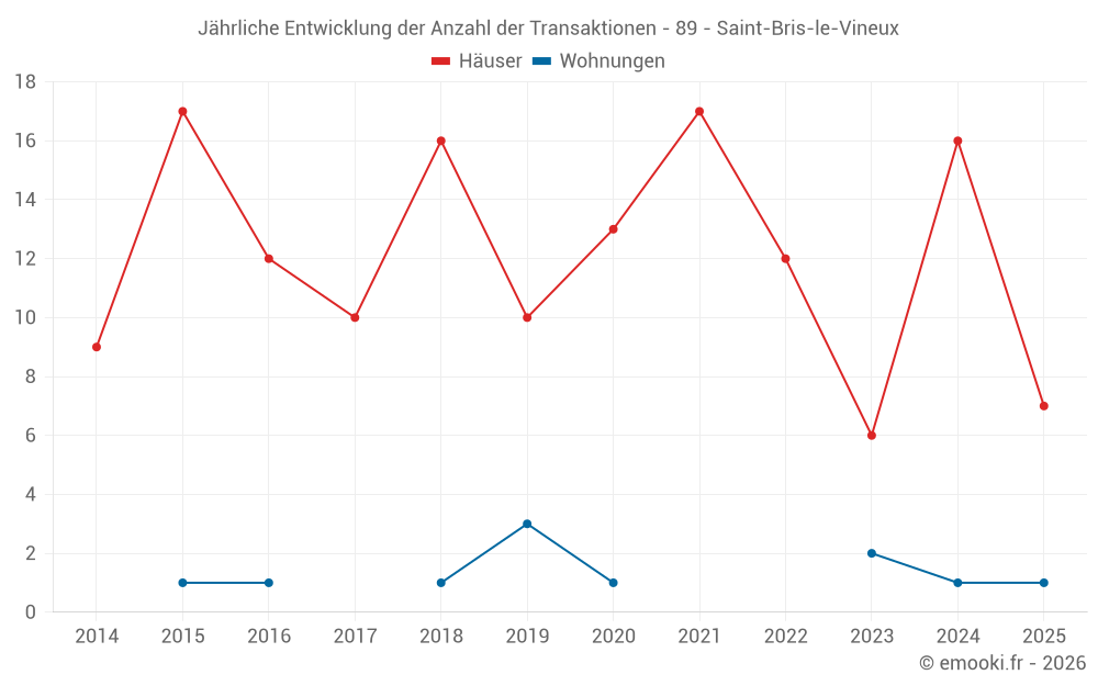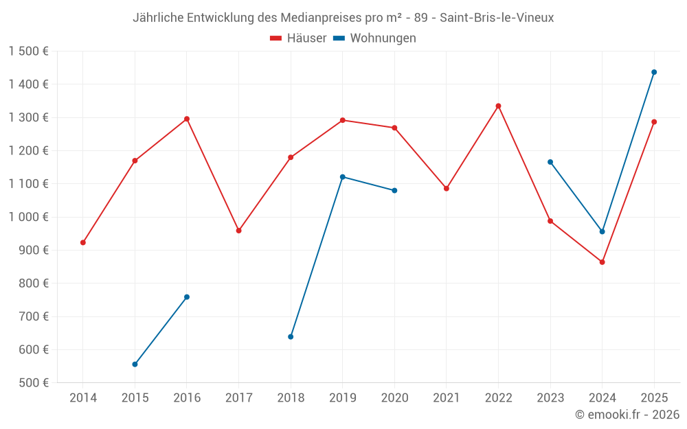 Der Durchschnittspreis auf den 16 Hausgeschäften der letzten 12 Monate in der Gemeinde Saint-Bris-le-Vineux betrug 855 € pro Quadratmeter für einen mittleren Immobilienwert von 80 250 €. Über diesen Zeitraum hinweg lagen 60% der Transaktionen zwischen 770 und 1 982 € pro Quadratmeter (vom 2. bis zum 8. Dezil).