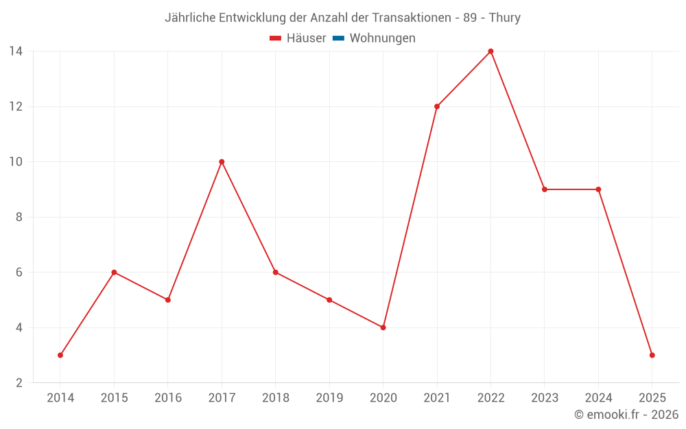 Der Durchschnittspreis auf den 15 Hausgeschäften der letzten 24 Monate in der Gemeinde Thury betrug 743 € pro Quadratmeter für einen mittleren Immobilienwert von 48 000 €. Über diesen Zeitraum hinweg lagen 60% der Transaktionen zwischen 260 und 1 209 € pro Quadratmeter (vom 2. bis zum 8. Dezil).