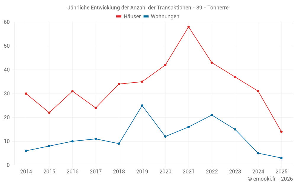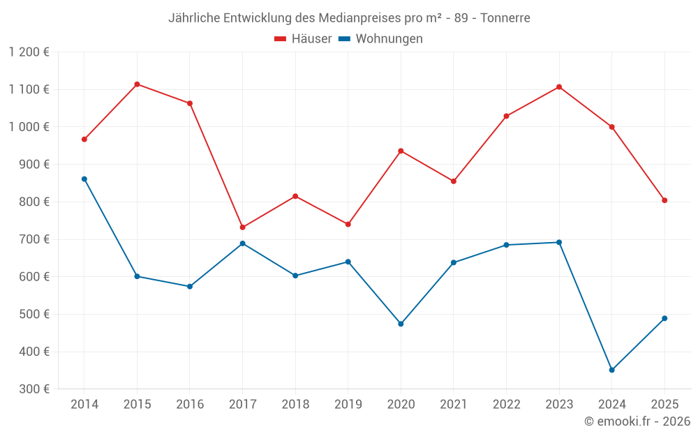 Der Durchschnittspreis auf den 31 Hausgeschäften der letzten 12 Monate in der Gemeinde Tonnerre betrug 887 € pro Quadratmeter für einen mittleren Immobilienwert von 75 000 €. Über diesen Zeitraum hinweg lagen 60% der Transaktionen zwischen 493 und 1 361 € pro Quadratmeter (vom 2. bis zum 8. Dezil).