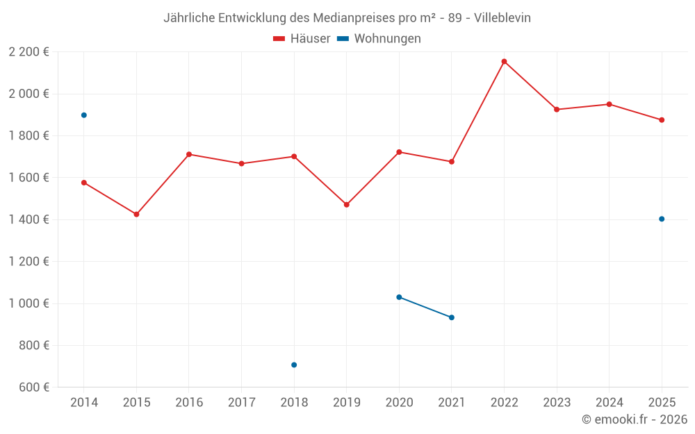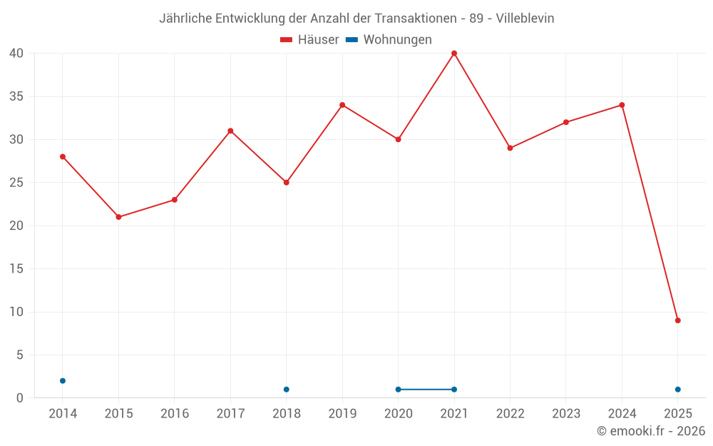 Der Durchschnittspreis auf den 25 Hausgeschäften der letzten 12 Monate in der Gemeinde Villeblevin betrug 1 875 € pro Quadratmeter für einen mittleren Immobilienwert von 209 000 €. Über diesen Zeitraum hinweg lagen 60% der Transaktionen zwischen 1 401 und 2 626 € pro Quadratmeter (vom 2. bis zum 8. Dezil).