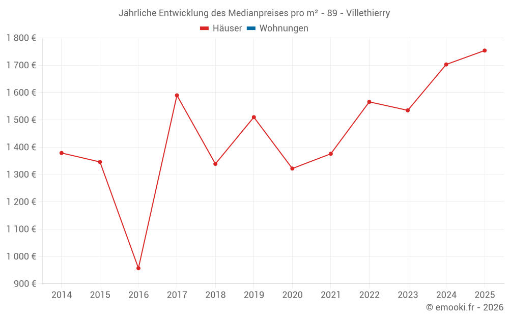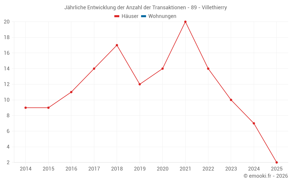 Der Durchschnittspreis auf den 15 Hausgeschäften der letzten 24 Monate in der Gemeinde Villethierry betrug 1 679 € pro Quadratmeter für einen mittleren Immobilienwert von 160 000 €. Über diesen Zeitraum hinweg lagen 60% der Transaktionen zwischen 1 243 und 1 978 € pro Quadratmeter (vom 2. bis zum 8. Dezil).
