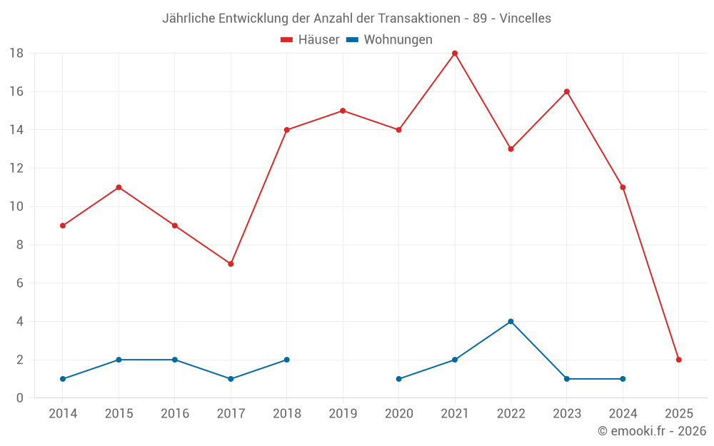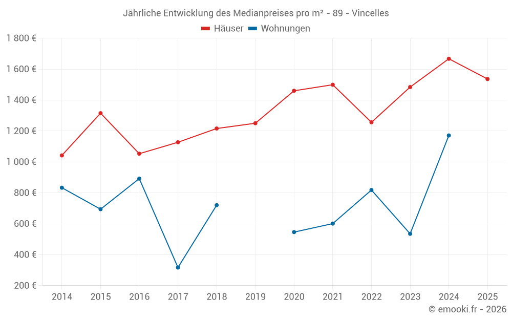 Der Durchschnittspreis auf den 21 Hausgeschäften der letzten 24 Monate in der Gemeinde Vincelles betrug 1 579 € pro Quadratmeter für einen mittleren Immobilienwert von 120 000 €. Über diesen Zeitraum hinweg lagen 60% der Transaktionen zwischen 953 und 1 765 € pro Quadratmeter (vom 2. bis zum 8. Dezil).
