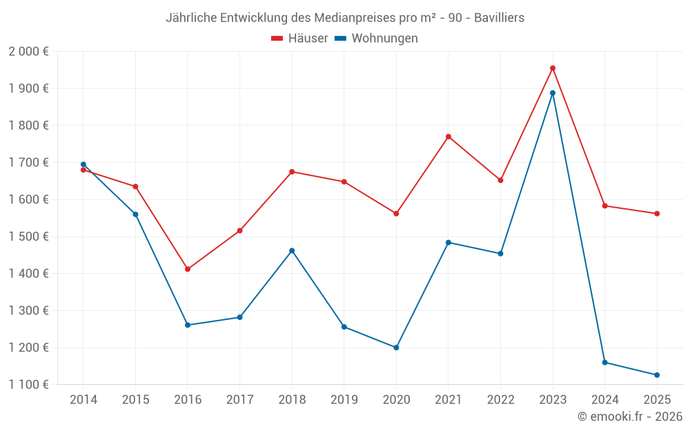 Der Durchschnittspreis auf den 19 Hausgeschäften der letzten 12 Monate in der Gemeinde Bavilliers betrug 1 647 € pro Quadratmeter für einen mittleren Immobilienwert von 160 000 €. Über diesen Zeitraum hinweg lagen 60% der Transaktionen zwischen 1 255 und 2 052 € pro Quadratmeter (vom 2. bis zum 8. Dezil).