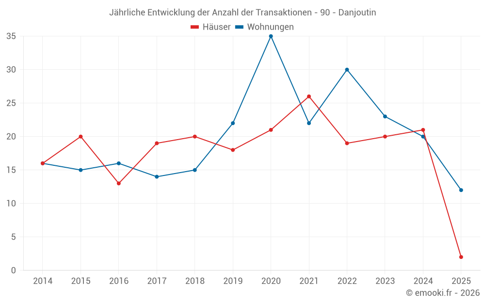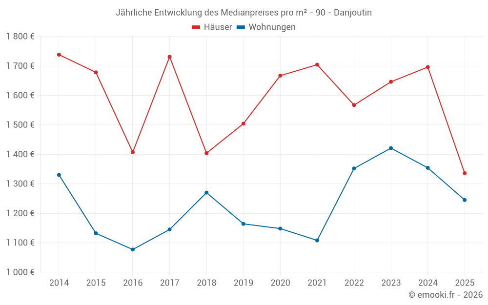 Der Durchschnittspreis auf den 16 Hausgeschäften der letzten 12 Monate in der Gemeinde Danjoutin betrug 1 701 € pro Quadratmeter für einen mittleren Immobilienwert von 193 750 €. Über diesen Zeitraum hinweg lagen 60% der Transaktionen zwischen 1 100 und 2 267 € pro Quadratmeter (vom 2. bis zum 8. Dezil).