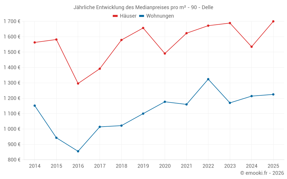 Der Durchschnittspreis auf den 28 Hausgeschäften der letzten 12 Monate in der Gemeinde Delle betrug 1 574 € pro Quadratmeter für einen mittleren Immobilienwert von 173 000 €. Über diesen Zeitraum hinweg lagen 60% der Transaktionen zwischen 1 234 und 2 210 € pro Quadratmeter (vom 2. bis zum 8. Dezil).