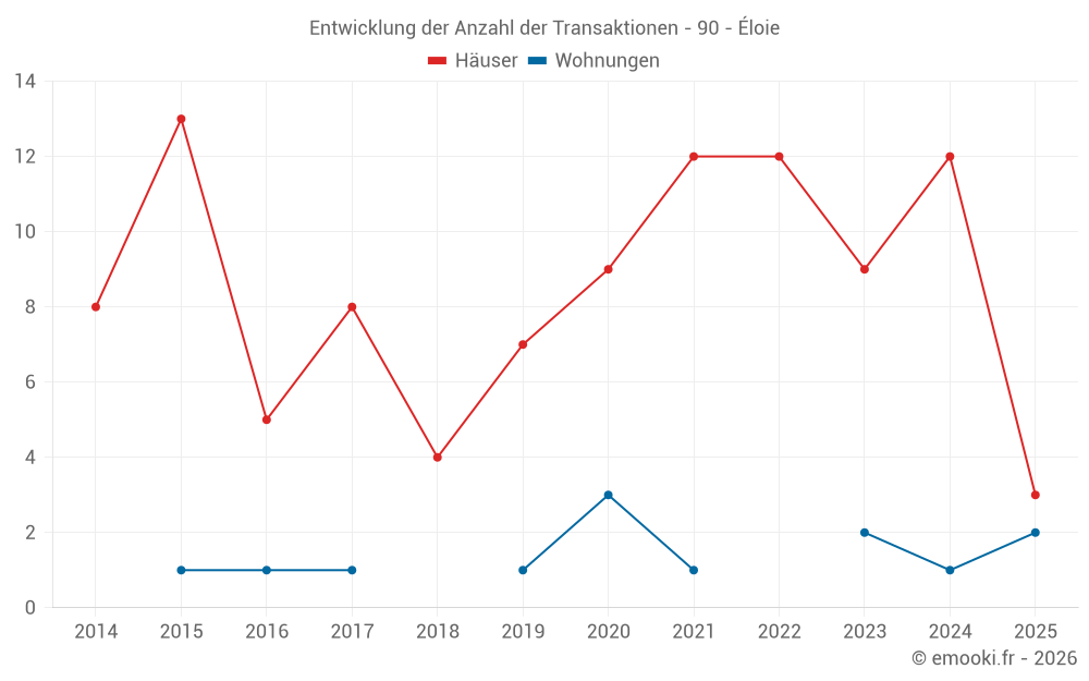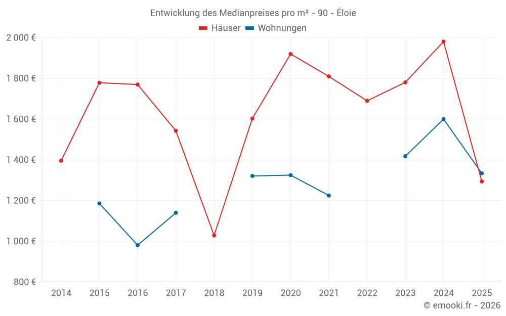 Der Durchschnittspreis auf den 17 Hausgeschäften der letzten 24 Monate in der Gemeinde Éloie betrug 1 947 € pro Quadratmeter für einen mittleren Immobilienwert von 231 550 €. Über diesen Zeitraum hinweg lagen 60% der Transaktionen zwischen 1 235 und 2 253 € pro Quadratmeter (vom 2. bis zum 8. Dezil).