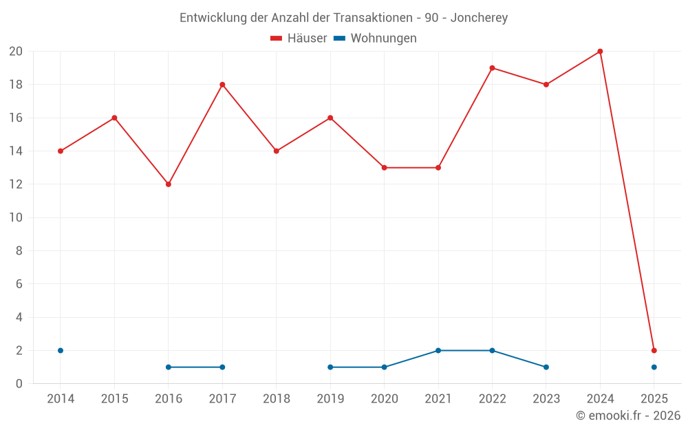 Der Durchschnittspreis auf den 33 Hausgeschäften der letzten 24 Monate in der Gemeinde Joncherey betrug 2 181 € pro Quadratmeter für einen mittleren Immobilienwert von 200 000 €. Über diesen Zeitraum hinweg lagen 60% der Transaktionen zwischen 1 676 und 2 449 € pro Quadratmeter (vom 2. bis zum 8. Dezil).