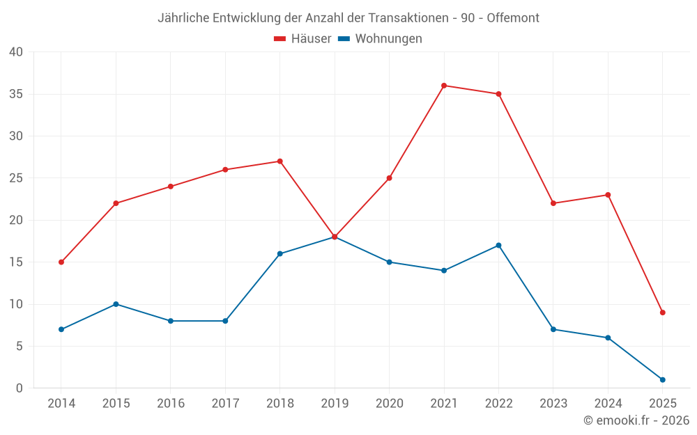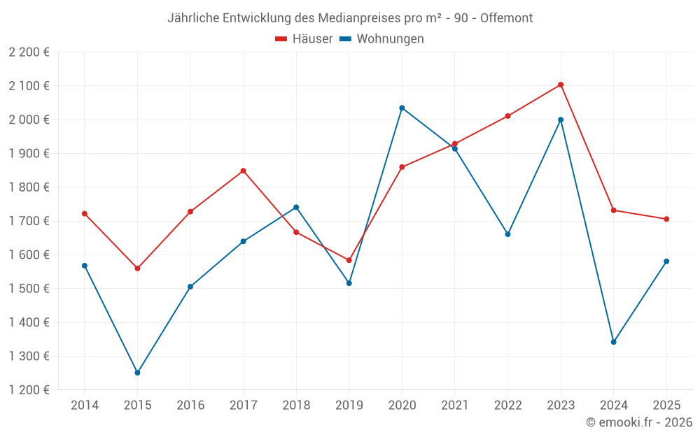 Der Durchschnittspreis auf den 28 Hausgeschäften der letzten 12 Monate in der Gemeinde Offemont betrug 1 801 € pro Quadratmeter für einen mittleren Immobilienwert von 177 100 €. Über diesen Zeitraum hinweg lagen 60% der Transaktionen zwischen 1 069 und 2 430 € pro Quadratmeter (vom 2. bis zum 8. Dezil).