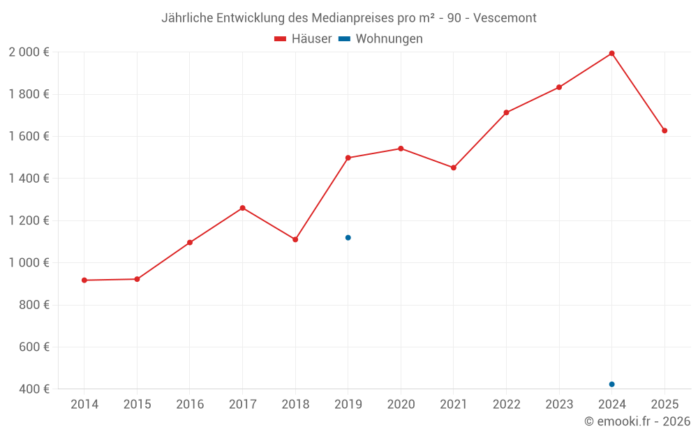 Der Preis pro m² von Häusern ist seit 1 Jahr um 18% gesunken, aber er ist in 11 Jahren um 77% gestiegen.