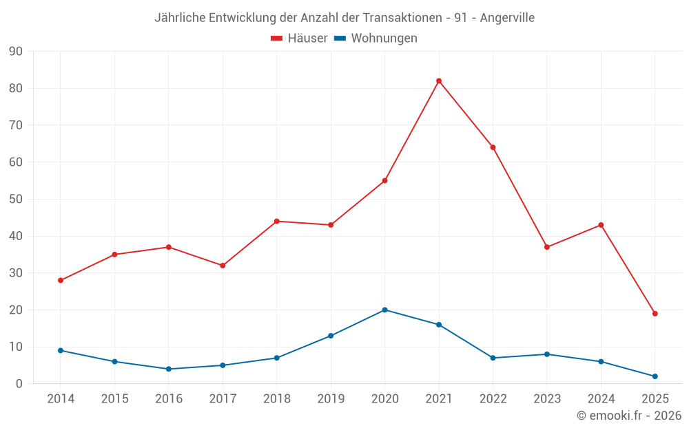 Der Durchschnittspreis auf den 19 Hausgeschäften der letzten 6 Monate in der Gemeinde Angerville betrug 2 238 € pro Quadratmeter für einen mittleren Immobilienwert von 224 500 €. Über diesen Zeitraum hinweg lagen 60% der Transaktionen zwischen 1 727 und 2 663 € pro Quadratmeter (vom 2. bis zum 8. Dezil).