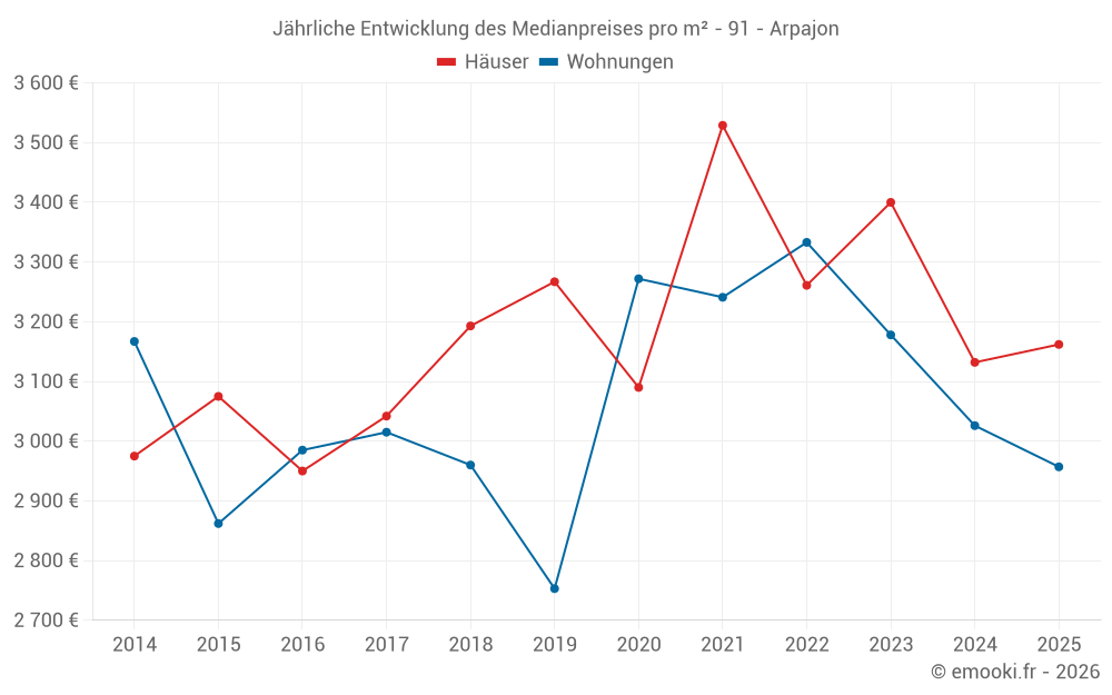 Der Durchschnittspreis auf den 43 Wohnungstransaktionen der letzten 6 Monate in der Gemeinde Arpajon betrug 2 957 € pro Quadratmeter für einen mittleren Immobilienwert von 140 000 €. Über diesen Zeitraum hinweg lagen 60% der Transaktionen zwischen 2 441 und 3 854 € pro Quadratmeter (vom 2. bis zum 8. Dezil).