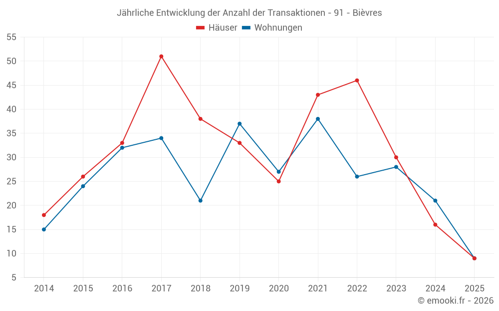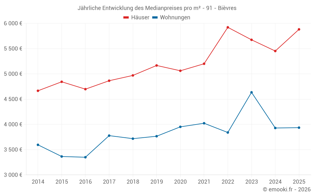 Der Durchschnittspreis auf den 19 Hausgeschäften der letzten 12 Monate in der Gemeinde Bièvres betrug 5 484 € pro Quadratmeter für einen mittleren Immobilienwert von 550 000 €. Über diesen Zeitraum hinweg lagen 60% der Transaktionen zwischen 5 038 und 6 269 € pro Quadratmeter (vom 2. bis zum 8. Dezil).