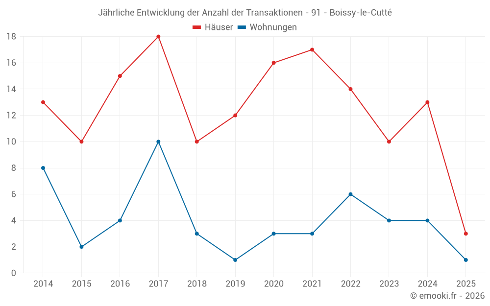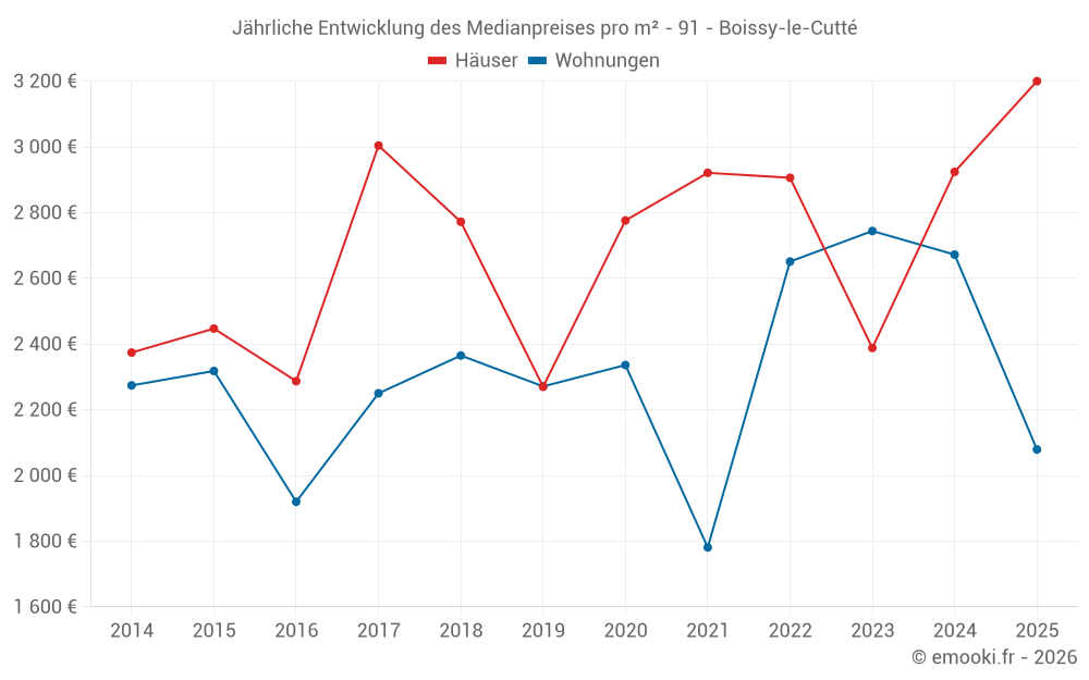Der Durchschnittspreis auf den 21 Hausgeschäften der letzten 24 Monate in der Gemeinde Boissy-le-Cutté betrug 2 924 € pro Quadratmeter für einen mittleren Immobilienwert von 270 000 €. Über diesen Zeitraum hinweg lagen 60% der Transaktionen zwischen 2 407 und 3 200 € pro Quadratmeter (vom 2. bis zum 8. Dezil).