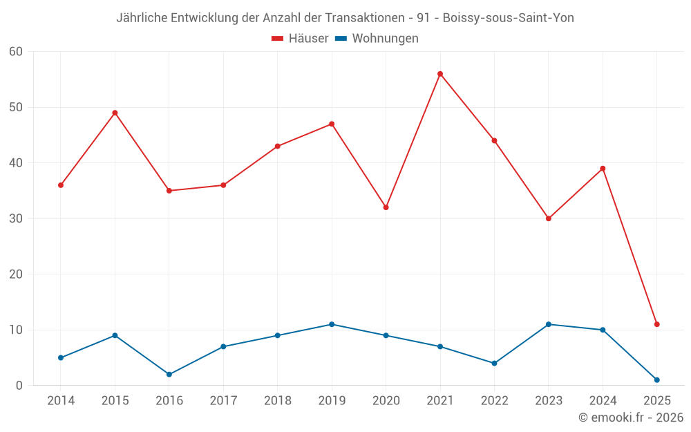 Der Durchschnittspreis auf den 36 Hausgeschäften der letzten 12 Monate in der Gemeinde Boissy-sous-Saint-Yon betrug 3 029 € pro Quadratmeter für einen mittleren Immobilienwert von 270 280 €. Über diesen Zeitraum hinweg lagen 60% der Transaktionen zwischen 2 608 und 3 288 € pro Quadratmeter (vom 2. bis zum 8. Dezil).
