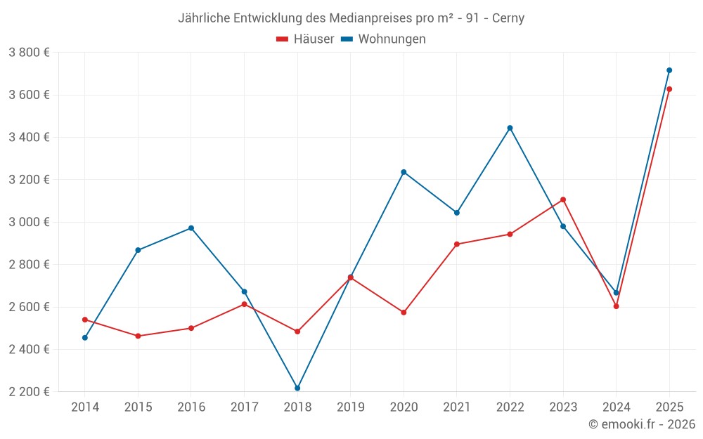Der Durchschnittspreis auf den 18 Hausgeschäften der letzten 6 Monate in der Gemeinde Cerny betrug 3 627 € pro Quadratmeter für einen mittleren Immobilienwert von 252 550 €. Über diesen Zeitraum hinweg lagen 60% der Transaktionen zwischen 2 624 und 4 454 € pro Quadratmeter (vom 2. bis zum 8. Dezil).