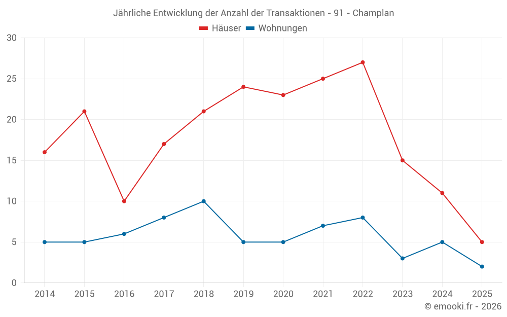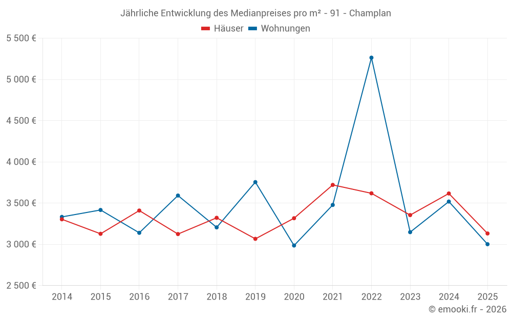 Der Durchschnittspreis auf den 25 Hausgeschäften der letzten 24 Monate in der Gemeinde Champlan betrug 3 320 € pro Quadratmeter für einen mittleren Immobilienwert von 312 000 €. Über diesen Zeitraum hinweg lagen 60% der Transaktionen zwischen 2 897 und 4 058 € pro Quadratmeter (vom 2. bis zum 8. Dezil).