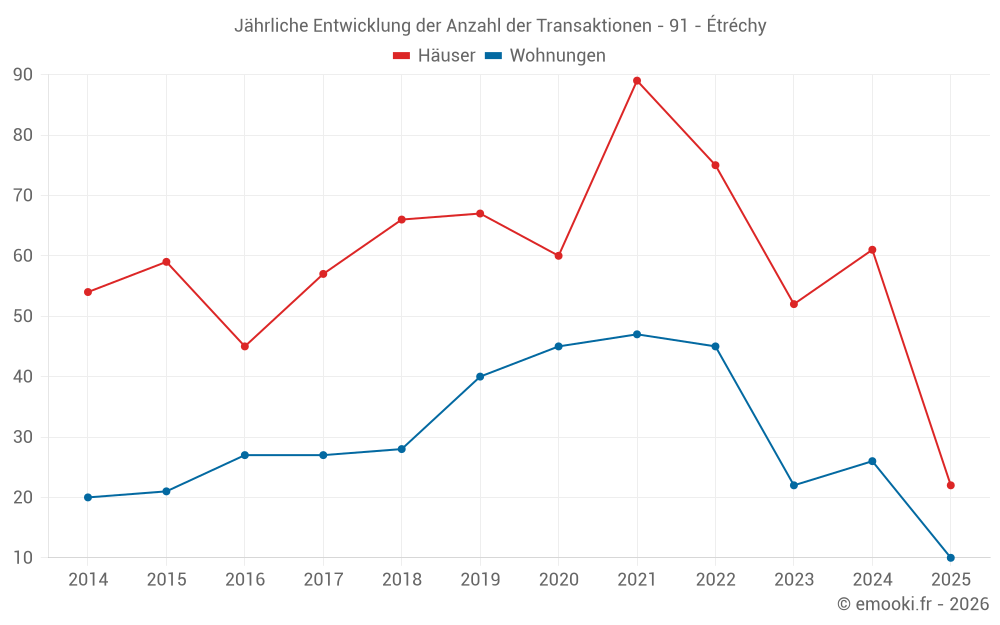 Der Durchschnittspreis auf den 20 Wohnungstransaktionen der letzten 12 Monate in der Gemeinde Étréchy betrug 2 644 € pro Quadratmeter für einen mittleren Immobilienwert von 137 500 €. Über diesen Zeitraum hinweg lagen 60% der Transaktionen zwischen 2 259 und 3 401 € pro Quadratmeter (vom 2. bis zum 8. Dezil).