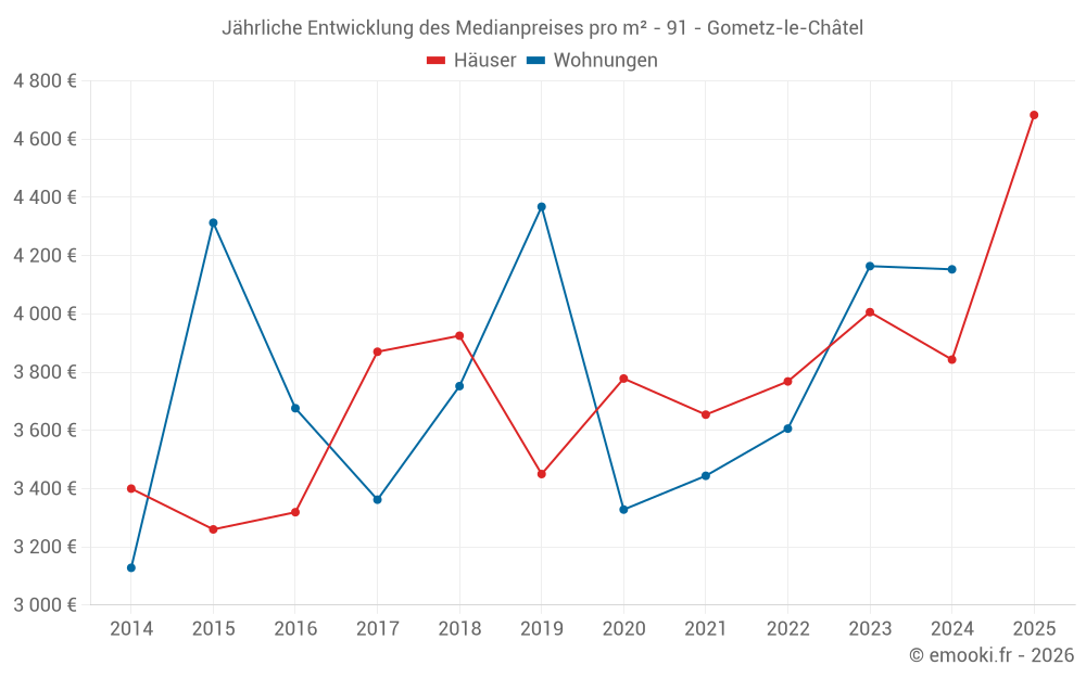 Der Durchschnittspreis auf den 26 Hausgeschäften der letzten 24 Monate in der Gemeinde Gometz-le-Châtel betrug 3 843 € pro Quadratmeter für einen mittleren Immobilienwert von 388 740 €. Über diesen Zeitraum hinweg lagen 60% der Transaktionen zwischen 3 101 und 4 813 € pro Quadratmeter (vom 2. bis zum 8. Dezil).