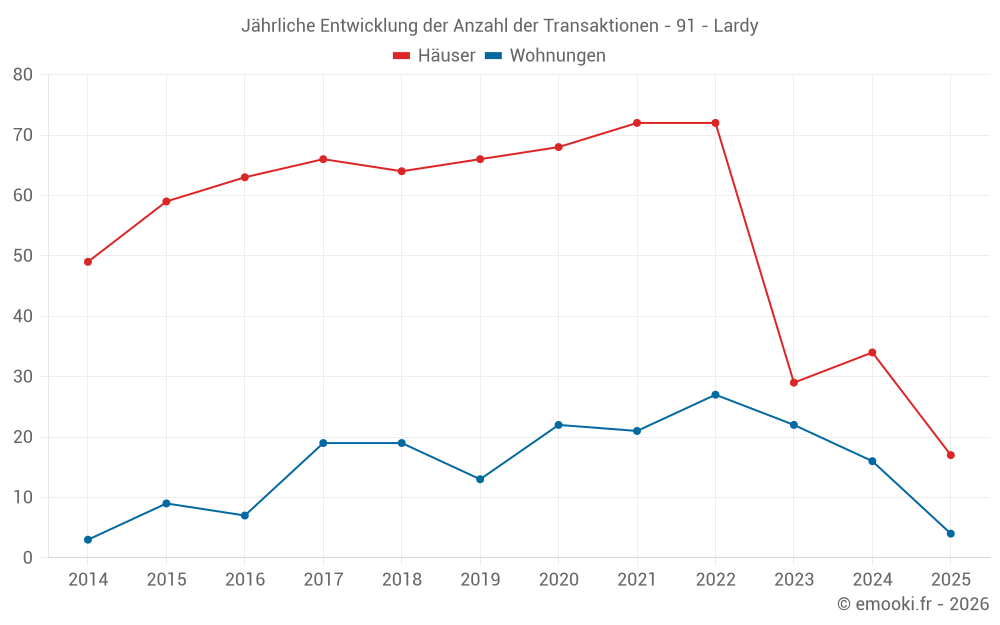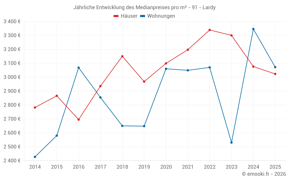 Der Durchschnittspreis auf den 29 Wohnungstransaktionen der letzten 24 Monate in der Gemeinde Lardy betrug 2 979 € pro Quadratmeter für einen mittleren Immobilienwert von 122 000 €. Über diesen Zeitraum hinweg lagen 60% der Transaktionen zwischen 2 269 und 3 949 € pro Quadratmeter (vom 2. bis zum 8. Dezil).