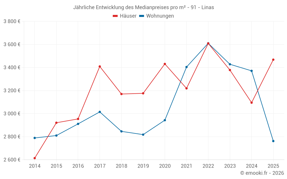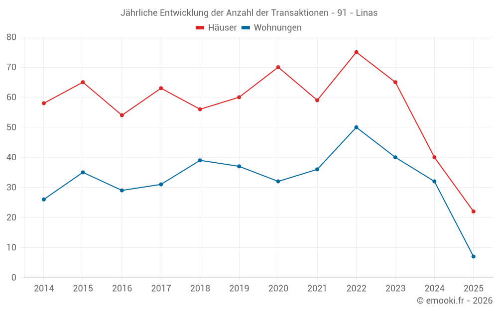 Der Durchschnittspreis auf den 22 Hausgeschäften der letzten 6 Monate in der Gemeinde Linas betrug 3 468 € pro Quadratmeter für einen mittleren Immobilienwert von 322 050 €. Über diesen Zeitraum hinweg lagen 60% der Transaktionen zwischen 2 384 und 4 030 € pro Quadratmeter (vom 2. bis zum 8. Dezil).