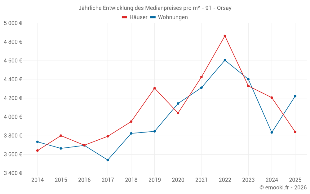 Der Durchschnittspreis auf den 24 Hausgeschäften der letzten 6 Monate in der Gemeinde Orsay betrug 3 840 € pro Quadratmeter für einen mittleren Immobilienwert von 403 050 €. Über diesen Zeitraum hinweg lagen 60% der Transaktionen zwischen 3 444 und 4 749 € pro Quadratmeter (vom 2. bis zum 8. Dezil).
