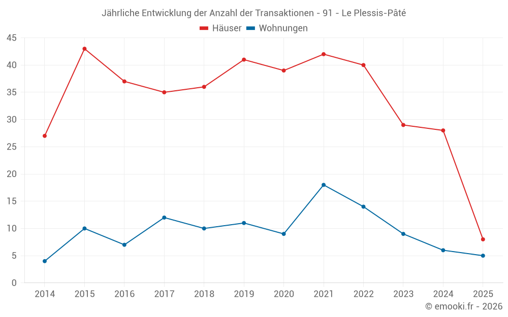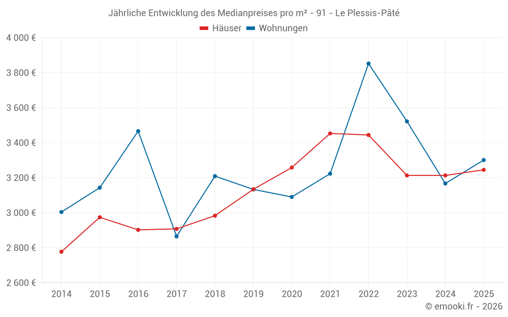 Der Durchschnittspreis auf den 14 Wohnungstransaktionen der letzten 24 Monate in der Gemeinde Le Plessis-Pâté betrug 3 226 € pro Quadratmeter für einen mittleren Immobilienwert von 159 000 €. Über diesen Zeitraum hinweg lagen 60% der Transaktionen zwischen 2 922 und 3 814 € pro Quadratmeter (vom 2. bis zum 8. Dezil).