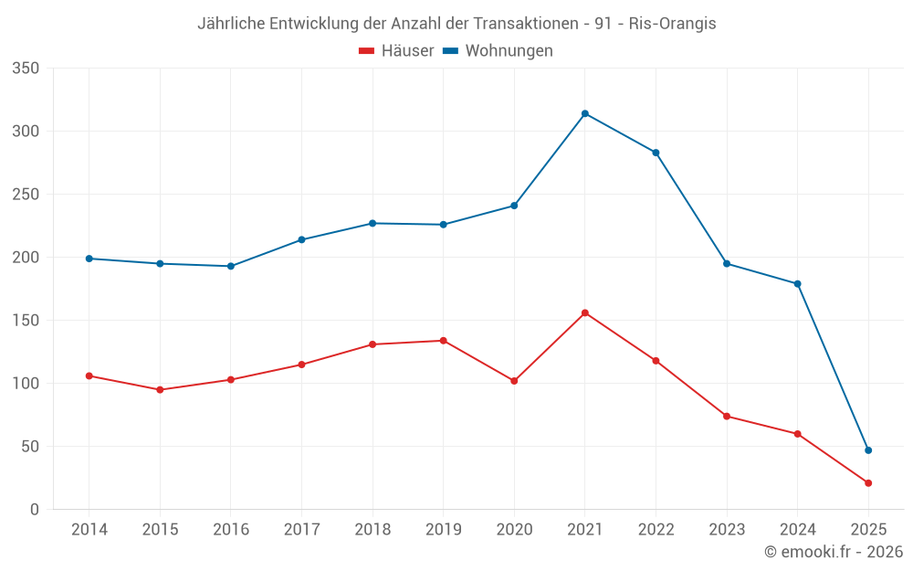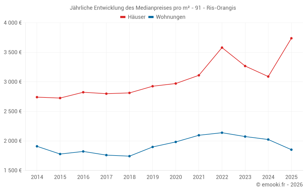 Der Durchschnittspreis auf den 21 Hausgeschäften der letzten 6 Monate in der Gemeinde Ris-Orangis betrug 3 738 € pro Quadratmeter für einen mittleren Immobilienwert von 270 000 €. Über diesen Zeitraum hinweg lagen 60% der Transaktionen zwischen 3 011 und 4 649 € pro Quadratmeter (vom 2. bis zum 8. Dezil).