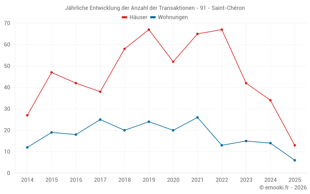 Der Durchschnittspreis auf den 27 Wohnungstransaktionen der letzten 24 Monate in der Gemeinde Saint-Chéron betrug 3 374 € pro Quadratmeter für einen mittleren Immobilienwert von 129 500 €. Über diesen Zeitraum hinweg lagen 60% der Transaktionen zwischen 2 849 und 4 082 € pro Quadratmeter (vom 2. bis zum 8. Dezil).