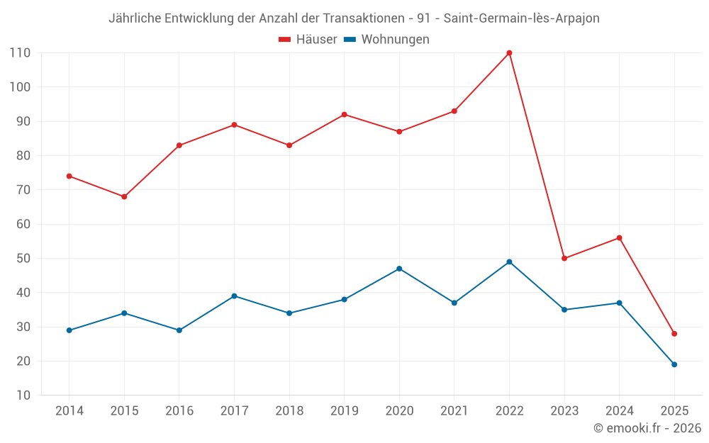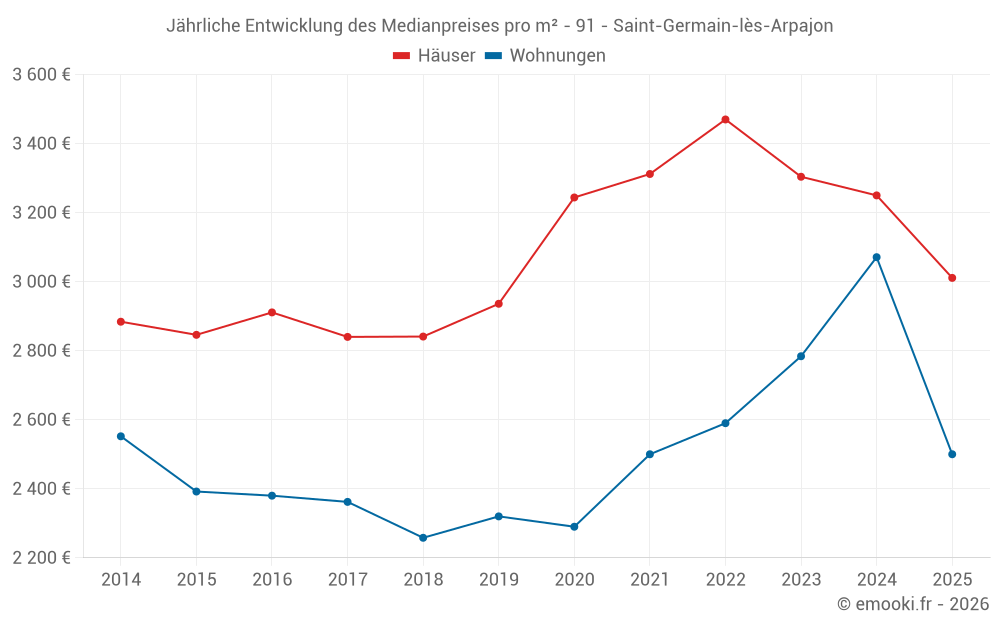 Der Durchschnittspreis auf den 28 Hausgeschäften der letzten 6 Monate in der Gemeinde Saint-Germain-lès-Arpajon betrug 3 011 € pro Quadratmeter für einen mittleren Immobilienwert von 281 250 €. Über diesen Zeitraum hinweg lagen 60% der Transaktionen zwischen 2 265 und 3 506 € pro Quadratmeter (vom 2. bis zum 8. Dezil).