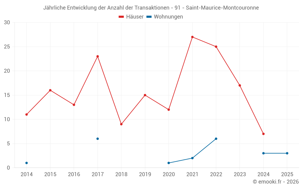 Der Durchschnittspreis auf den 15 Hausgeschäften der letzten 24 Monate in der Gemeinde Saint-Maurice-Montcouronne betrug 3 087 € pro Quadratmeter für einen mittleren Immobilienwert von 323 000 €. Über diesen Zeitraum hinweg lagen 60% der Transaktionen zwischen 2 889 und 3 608 € pro Quadratmeter (vom 2. bis zum 8. Dezil).