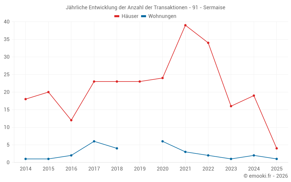 Der Durchschnittspreis auf den 29 Hausgeschäften der letzten 24 Monate in der Gemeinde Sermaise betrug 2 731 € pro Quadratmeter für einen mittleren Immobilienwert von 290 000 €. Über diesen Zeitraum hinweg lagen 60% der Transaktionen zwischen 2 341 und 3 209 € pro Quadratmeter (vom 2. bis zum 8. Dezil).
