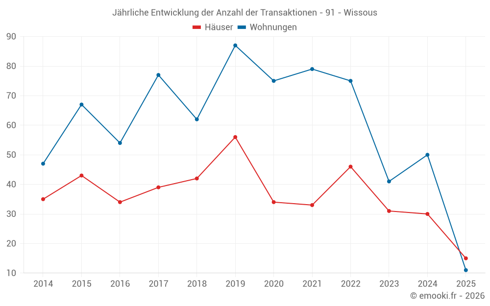 Der Durchschnittspreis auf den 30 Hausgeschäften der letzten 12 Monate in der Gemeinde Wissous betrug 3 981 € pro Quadratmeter für einen mittleren Immobilienwert von 397 950 €. Über diesen Zeitraum hinweg lagen 60% der Transaktionen zwischen 3 139 und 5 256 € pro Quadratmeter (vom 2. bis zum 8. Dezil).